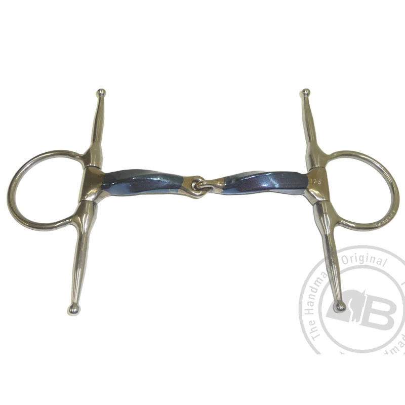 The Bombers Bits Full Cheek Twisted Snaffle is modeled on the plain snaffle. A popular bit due to the curved mouthpiece which distributes pressure more evenly over tongue and bars. With the offset center link it will reduce the nutcracker action and pressure points on the tongue.