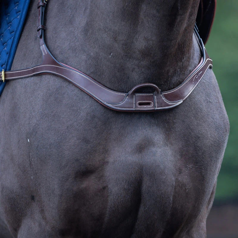 The breastplate attaches at the following five points: two at the ‘ D ‘ rings of the saddle, two at the Girth straps and finally one attachment at the girth. The girth strap can be removed and as a result leaves you with a breastcollar.