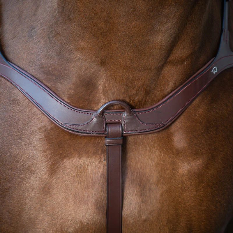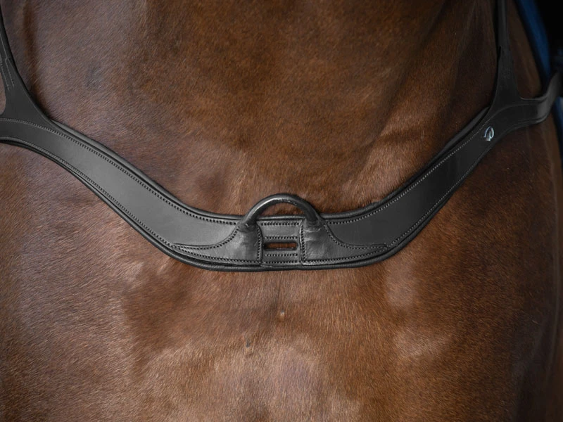 The breastplate design offers freedom of movement, allowing less pressure over the shoulder. The breastplate attaches to the girth of the saddle and is suitable for both monoflap and double flap saddles. The breastplate can also be detached from the girth strap if it is not required.