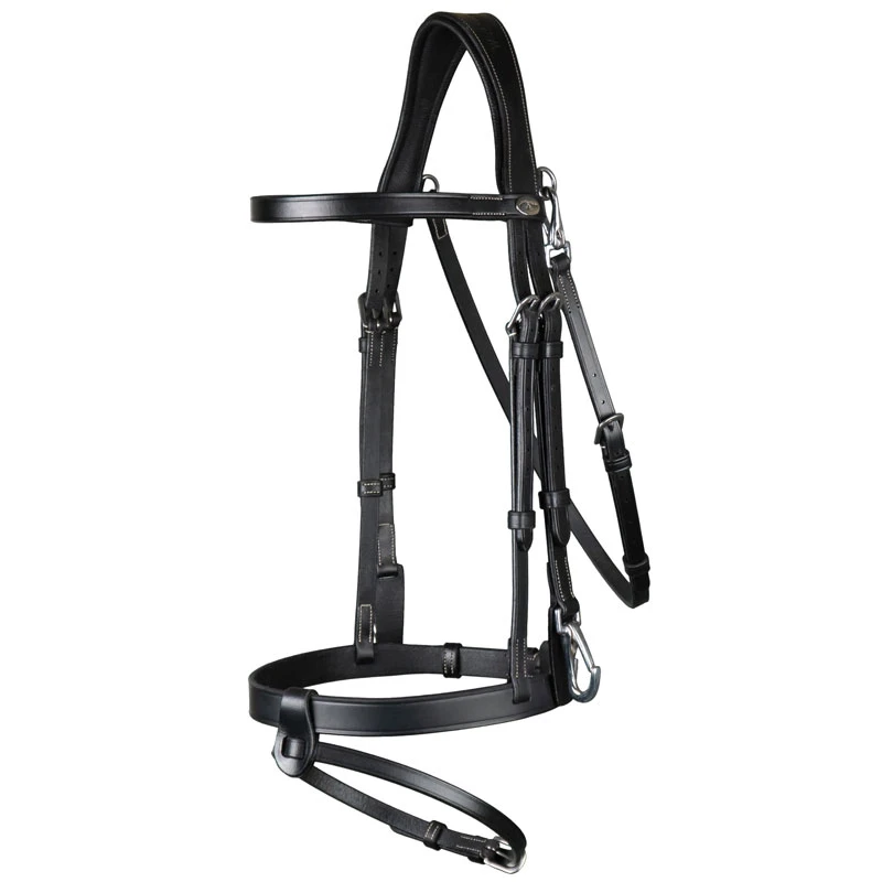 The noseband features a roller buckle to prevent undue wear on the leather. Stainless steel engraved buckles, clips that attach the bridle to the bit, a clip fastening at the throat lash and cream stitching complete the look of this very stylish bridle.