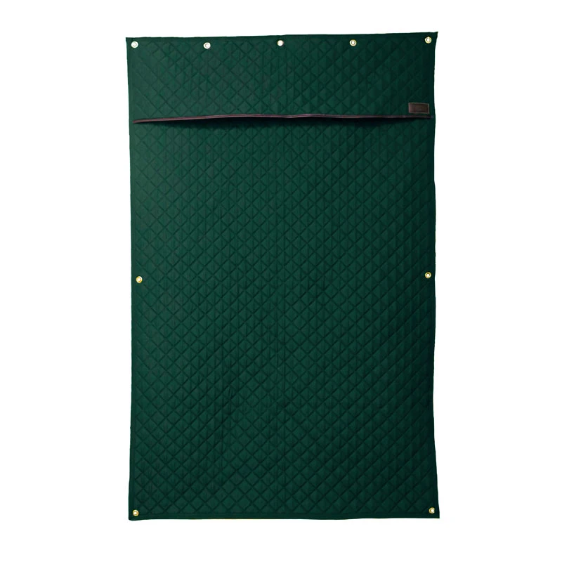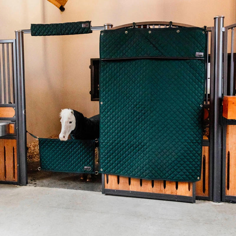 The Kentucky Horsewear Stable Curtain – Dark Green offers your horse the well-deserved rest at shows and at home. Featuring five gold colored reinforced rings to attach to the stable. Under the flap are five snap hooks to attach accessories such as bridles, rack for rugs, grooming hook, etc. The snap hooks are carefully put away behind the flap with artificial leather Kentucky logo so you don’t see them.
