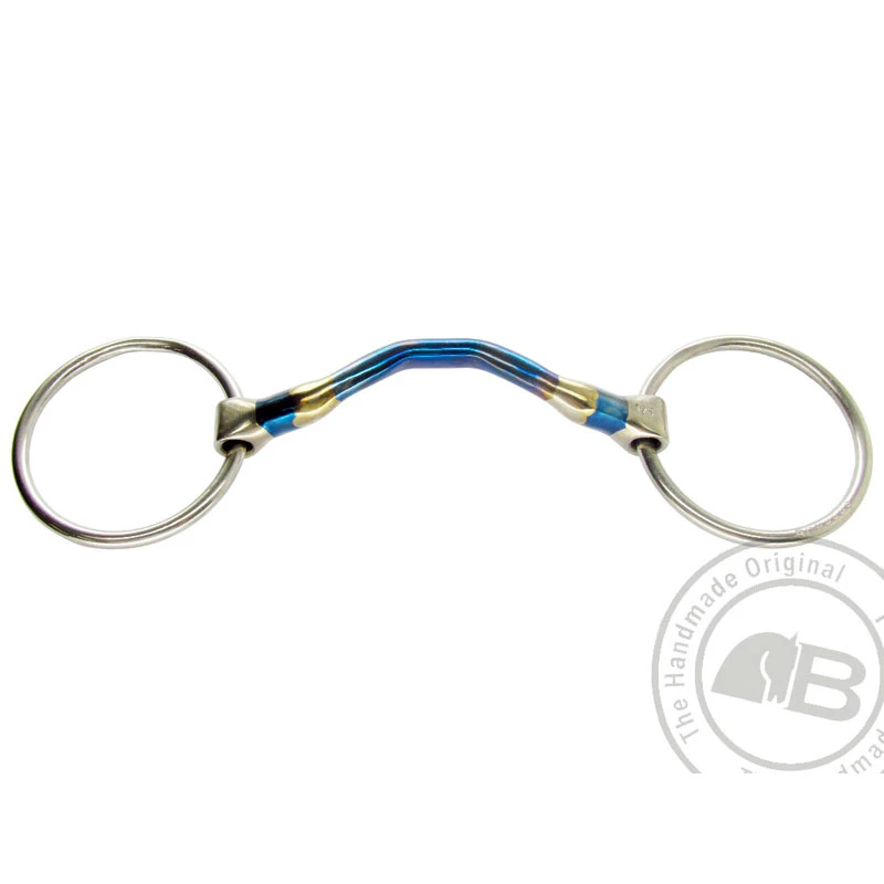 The Bombers Happy Tongue Loose Ring mouthpiece is made with original sweet iron. This helps encourages salivation, thanks to the oxidation of the metal as it becomes exposed to the horses saliva and air. As a result the sweet iron helps better acceptance of the bit and also offers a sweet taste to the horse as it rusts up.