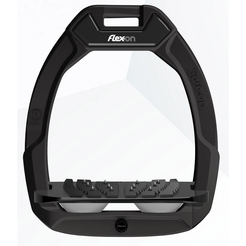 Safe-On Safety Stirrups in black frame, black tread plate and grey shock absorbing elastomers and quick release arm. A grey flexible branch on the outside of the stirrup helps reduce the risk of injury by allowing your foot to release.
